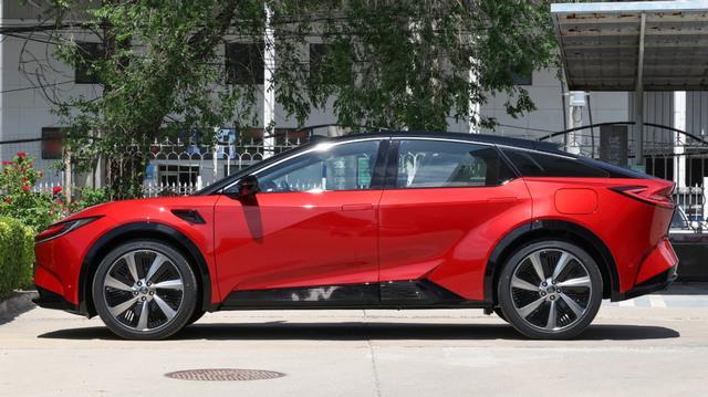 而来到车身侧面之后,虽然丰田bz5定位中型SUV,但整车的车身姿态并不是一台传统的SUV,一定程度上与雪铁龙凡尔赛C5 X相近,属于跨界车型。不过相比之下,丰田bz5的车身比例更为协调,同时伸缩式开启的隐藏式门把手,以及除了入门版均标配的21英寸大轮毂,这些也都有效的提升了丰田bz5的年轻时尚感和运动感。